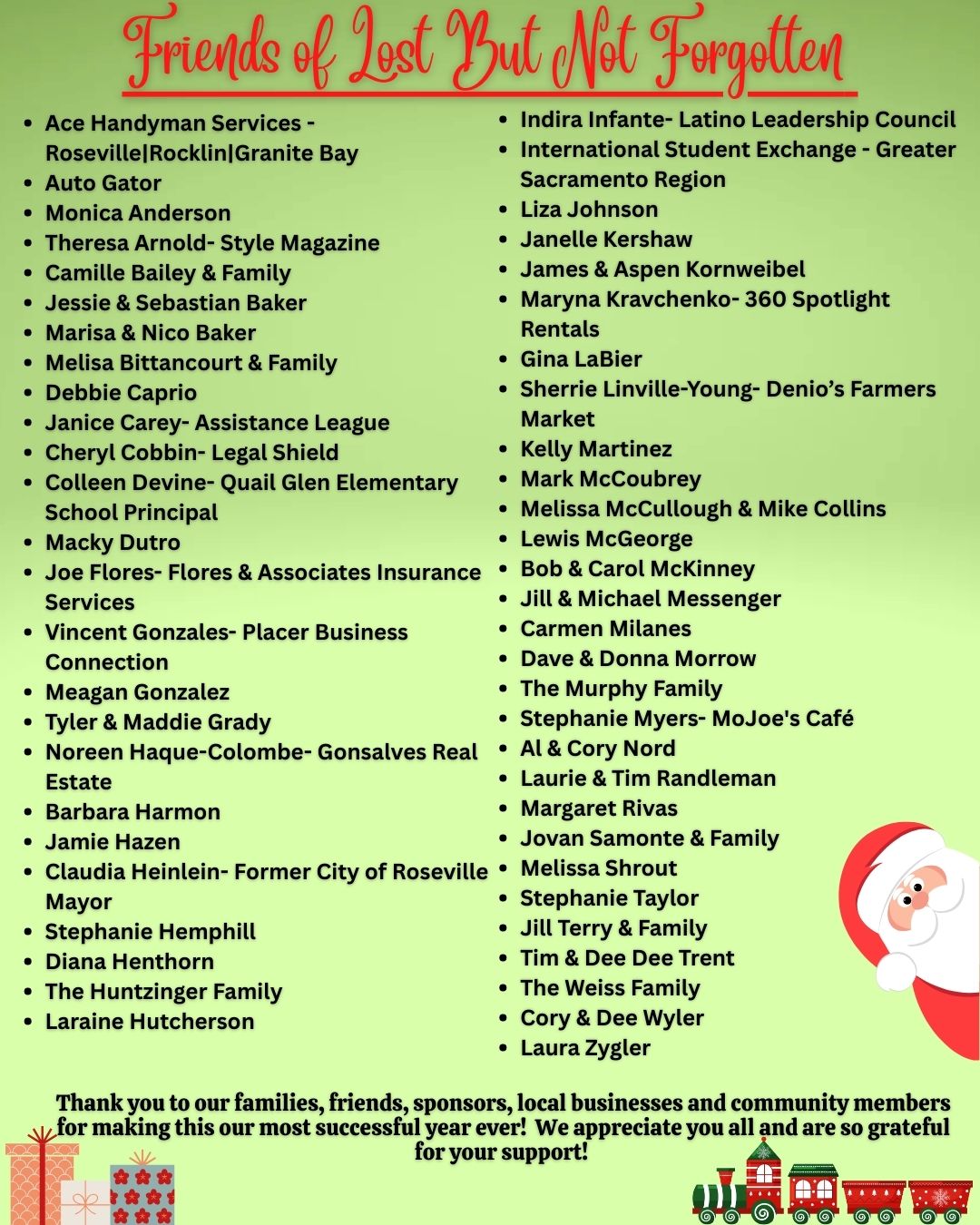 We thank our amazing sponsors from the bottoms of our hearts for providing such a remarkably generous gift to these teenagers and kids. By supporting Lost But Not Forgotten, they are giving these families something so much more than just material presents...